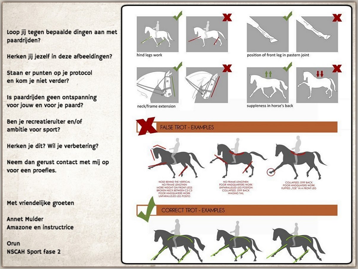 Vanuit het paard denken en daar de training op aanpassen is wat ik jullie graag wil bijbrengen in mijn lessen.